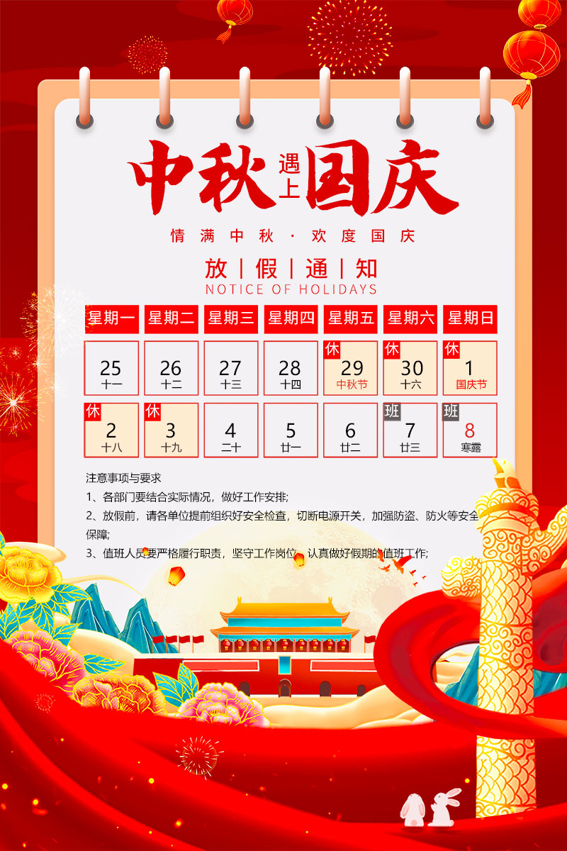根據(jù)《國(guó)務(wù)院辦公廳關(guān)于2023年部分節(jié)假日安排的通知》,結(jié)合我公司的實(shí)際情況,現(xiàn)將我公司2023年中秋、國(guó)慶放假具體安排如下:
