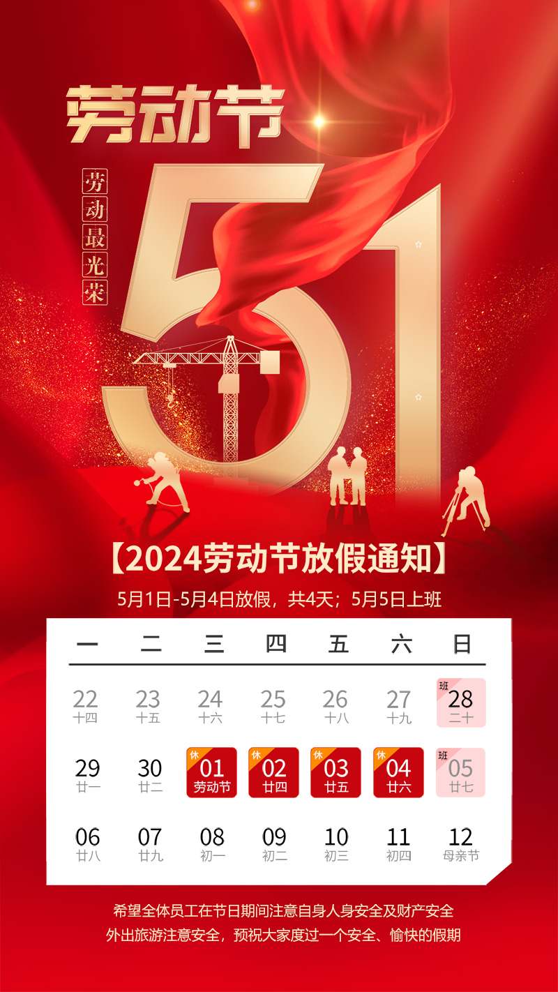 根據(jù)《國務(wù)院辦公廳關(guān)于2024年部分節(jié)假日安排的通知》,結(jié)合我公司的實際情況,現(xiàn)將我公司2024年五一放假具體安排如下: