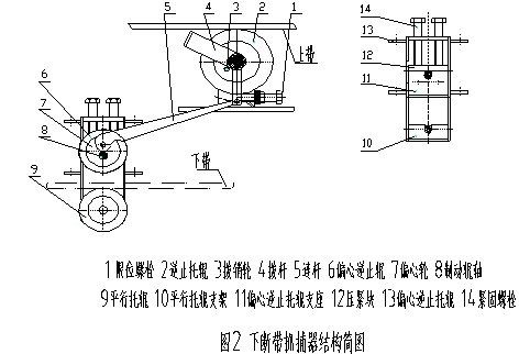 下斷帶保護裝置(見圖2)主要有逆止托輥2、平行托輥9、偏心逆止托輥6、制動連桿5、撥桿4等組成,偏心逆止托輥內(nèi)裝有偏心輪6、制動輥軸8及偏心輪傳動機構(gòu),逆止托輥裝有撥銷輪3及傳動機構(gòu)。
