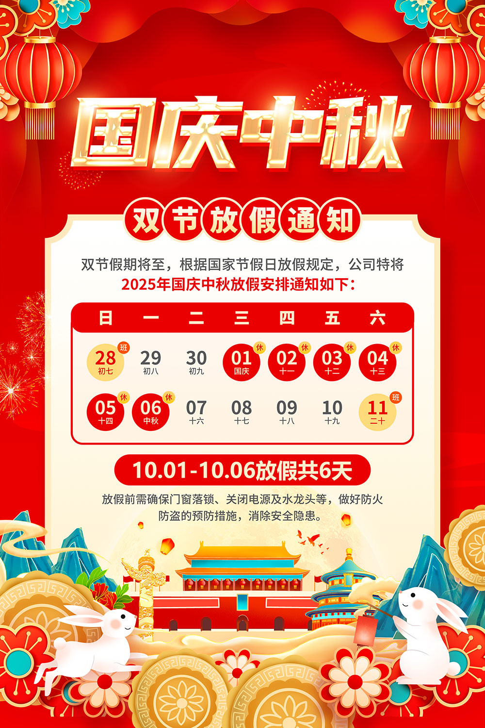 根據(jù)《國務(wù)院辦公廳關(guān)于2025年部分節(jié)假日安排的通知》,結(jié)合我公司的實際情況,現(xiàn)將我公司2025年國慶、中秋雙節(jié)放假具體安排如下: